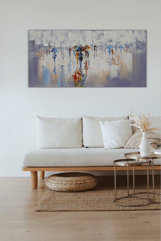 You stand before your impressionistic painting depicting a misty and rainy scene in shades of purple, beige, and white, filled with people walking under colorful umbrellas. The painting captures a scene that feels both mysterious and lively, with each umbrella adding a touch of color to the muted background. Every time you look at the painting, you are reminded of the city’s vibrant life even on gray days. It’s a painting that gives a sense of connection with people on the move, despite the dreary weather.