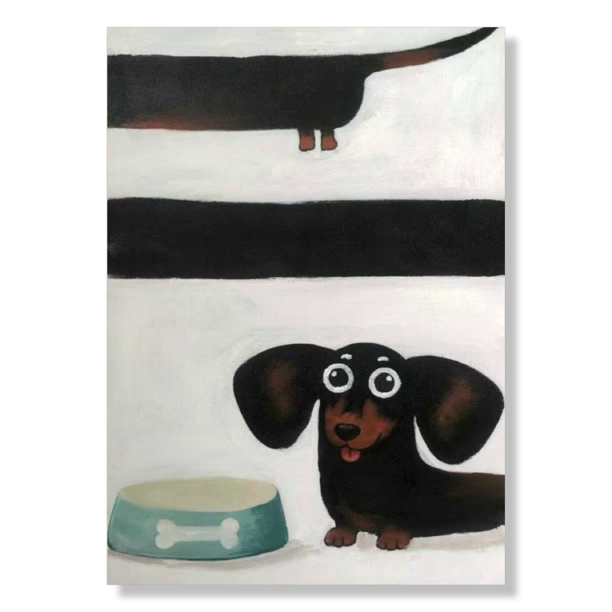 It’s Dachs is a playful and charming painting that captures the distinctive personality of a dachshund with warmth and humour. In the composition we meet a small dog with large curious eyes and long ears, sitting next to its food bowl. The graphic composition – where the long silhouette of the dachshund stretches across the painting – adds a humorous rhythm and a modern visual expression.