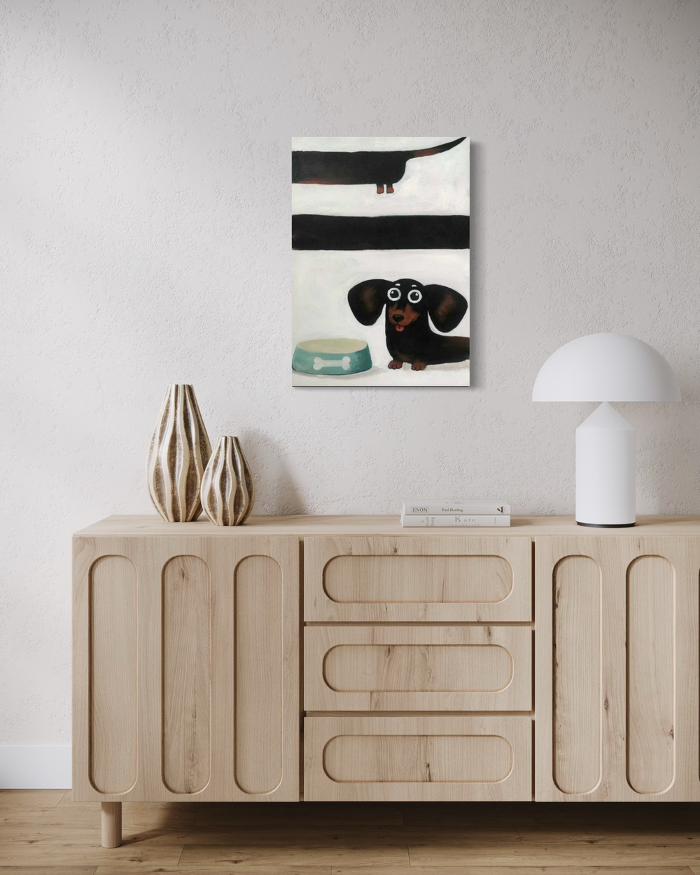Soft brushstrokes and a simple colour palette allow the character of the dog to take centre stage. It’s Dachs balances playful innocence with clean minimalism, resulting in a light-hearted and decorative artwork full of personality.