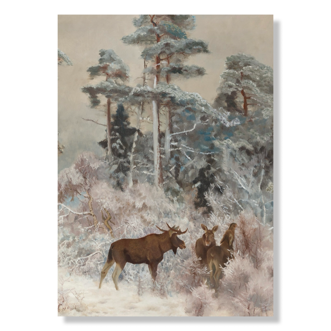 Moose in Winter Landscape – Canvas Collection is part of our Timeless Masterpieces concept, presenting Bruno Liljefors’ nature painting in a contemporary, architectural format. The artwork depicts moose in a winter landscape – calm, alert and deeply rooted in the Nordic forest. The interaction between snow, trees and animals creates a motif defined by tranquillity, strength and presence.