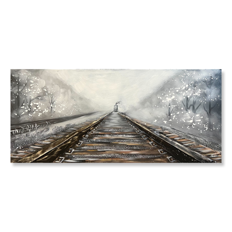 You stand before your beautiful painting where you get the feeling of standing on a railroad track, and in the distance on the horizon, you glimpse a train that is either heading toward you or away from you. The painting captures both the excitement and uncertainty, with the distant shape of the train giving a sense of anticipation. Each time you view the artwork, you feel a mix of curiosity and nervousness, as if something significant is about to happen. This painting serves as a reminder that life sometimes involves waiting and being ready for whatever comes.