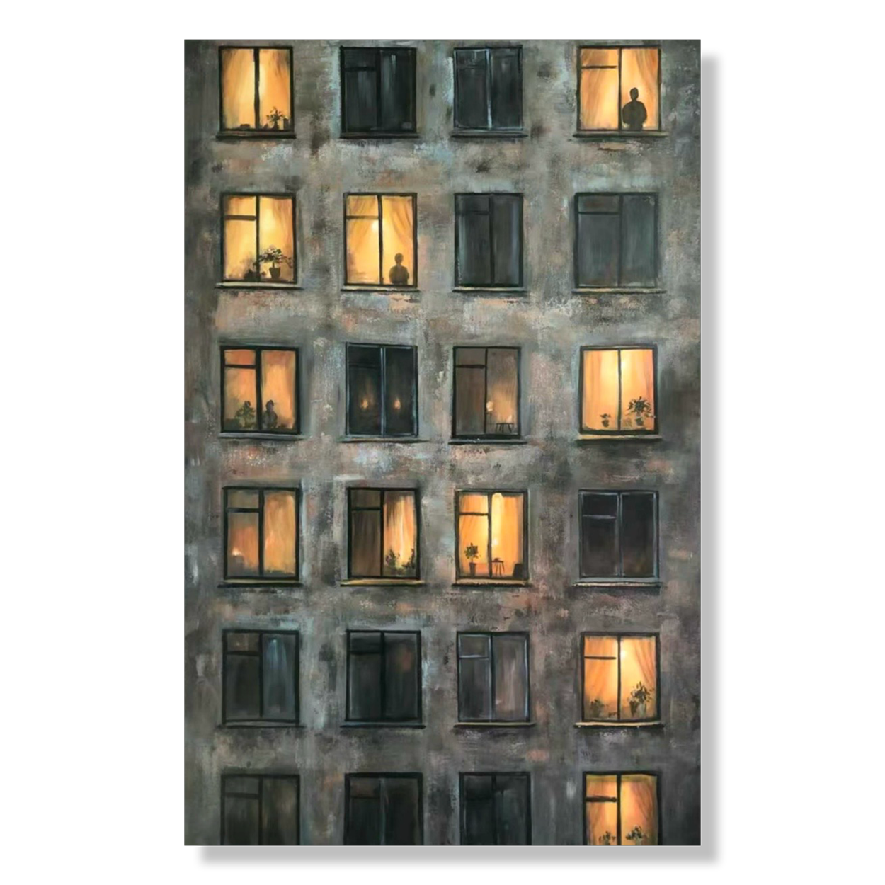 Windows is a poetic portrayal of the quiet evening moments of the city – small glimpses of life unfolding behind illuminated windows as darkness settles over the façade. Rows of windows create a rhythmic pattern across the building, where some rooms glow warmly while others remain in shadow. Silhouettes of people, plants and interior details suggest stories taking place beyond the walls.